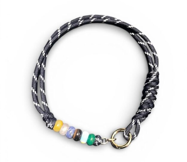 Collar de cordel artesanal, elaborado con cordón textil trenzado en tono oscuro con detalles claros. Incorpora una delicada combinación de cuentas multicolor que aportan contraste y personalidad al diseño. Cuenta con argolla metálica dorada que funciona como cierre y detalle decorativo.